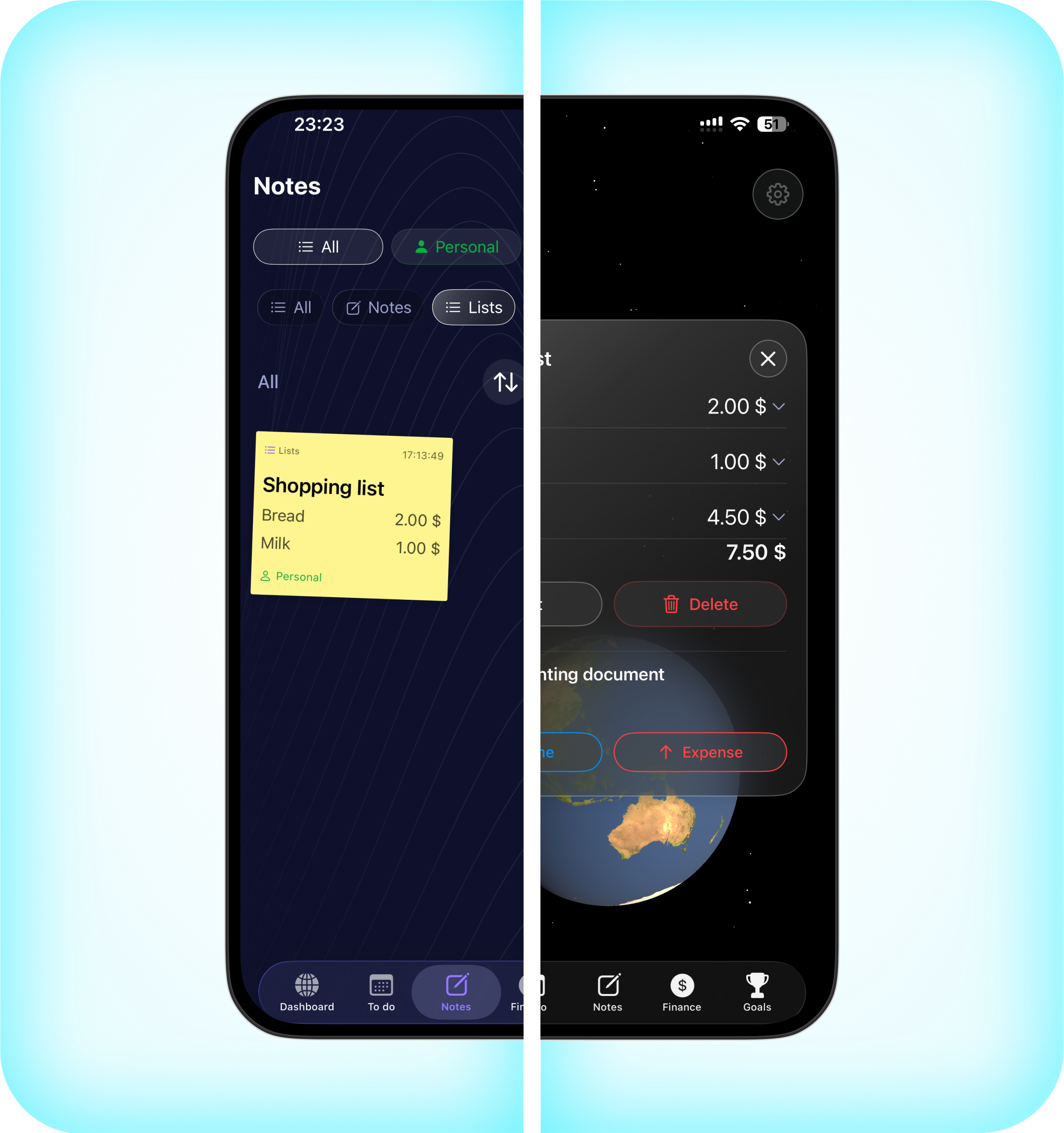 Create notes and lists. Link them to tasks and goals for better organization. Shopping lists with prices and currencies with one-click transfer to financial accounting.